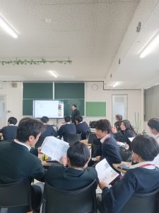 2025年11月20日、京都府立向陽高校3年生34名を対象に実施しました。この講義では,最初に、福島第一原発事故前後における日本のエネルギー政策の変容について述べ、火力発電(特に、LNG:液化天然ガス)を中心とする現在の電源構成比率について解説しました。続いて、この火力発電に依存する現状と、ここ数年の地球温暖化の影響について述べ、二酸化炭素排出削減が急務であること、2050年のカーボンニュートラルに向けて、火力発電から原発再稼働と再生可能エネルギーの比率を今後、向上させていく傾向にあることを述べました。