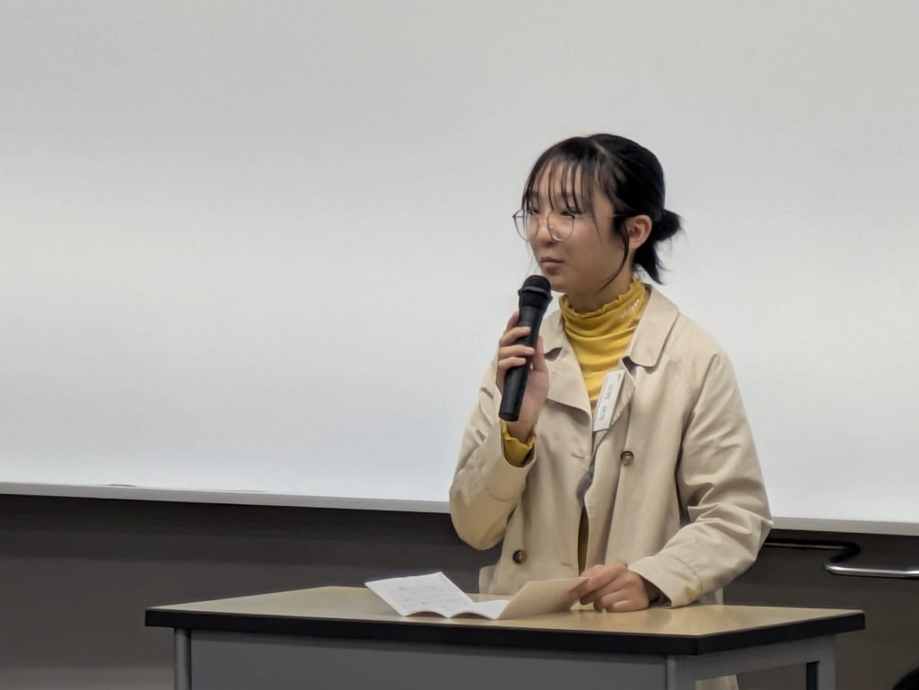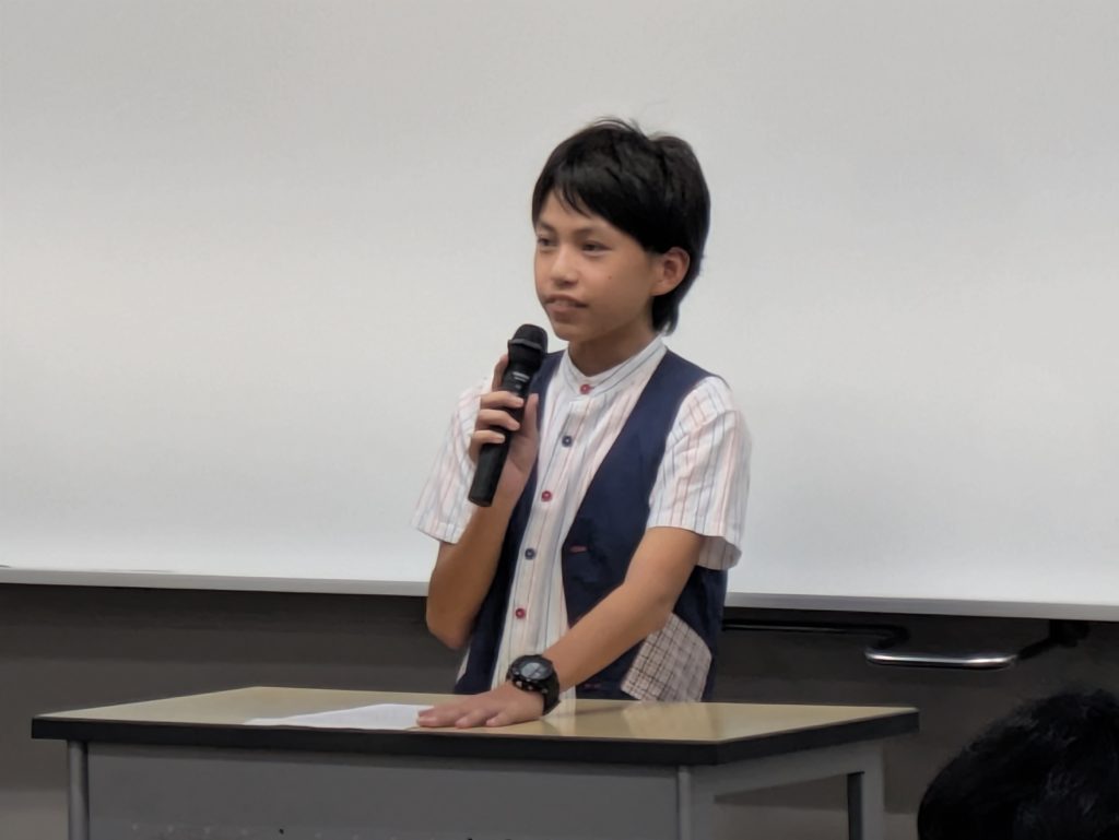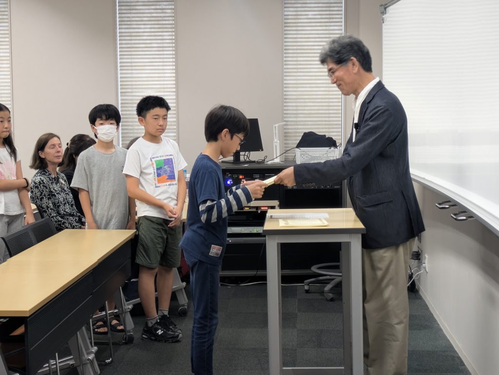 続いて、受講生を代表して松田敦宏さん(小6)が挨拶。「最初はあまり参加することに乗り気ではなかったけれど、毎回のプログラムがとても楽しく、今日が最後だと思うと寂しくもある」と感想をいただき、また長野綾花さん(中3)は、「プログラムを受ける前は『なぜ?』と疑問があってもそのままにしていたけれど、今では疑問をノートに書き留めて、自分で調べたり、先生に質問をするようになった」と、この1年間の変化を述べてくれました。最後に高見茂学長より、「どんなことも最後までやり遂げることが大切です」とのメッセージが贈られ、温かい拍手に包まれながら修了式を締めくくりました。