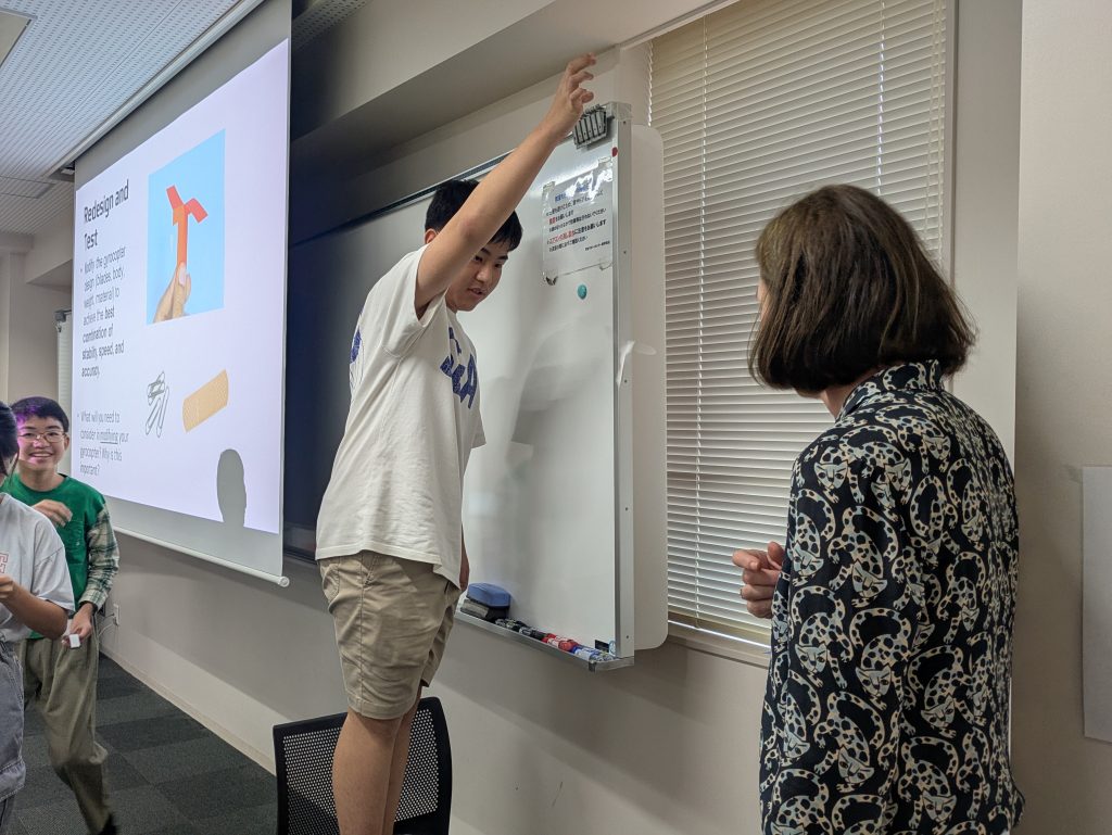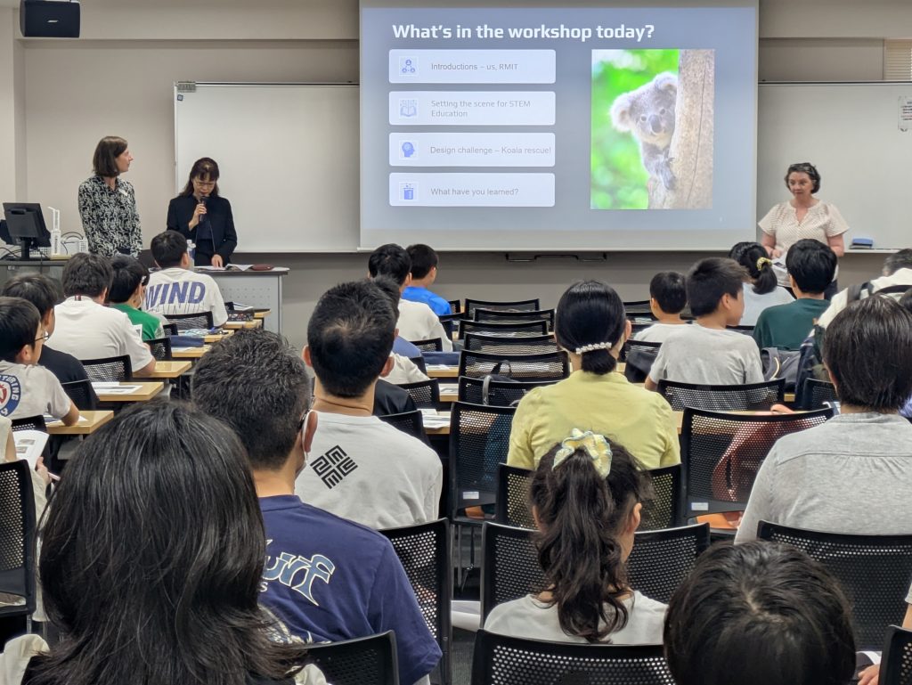 2025年10月5日(日)、本学にて第12回チャレンジプログラムを開催し、36名の受講生が参加しました。今回のプログラムは、オーストラリアのロイヤルメルボルン工科大学よりアマンダ・ベリー教授とキャシー・スミス准教授にお越しいただき、「STEM教育~デザイン・チャレンジ」というタイトルでワークショップをしていただきました。海外からの先生ということで、講義が始まるまで受講生たちはいつもと違う雰囲気に少し緊張している様子でしたが、「森林火災からコアラを救出しよう!」という、ジャイロコプターを作成して行う実験で教室内の空気が一変!受講生同士、お互いに相談しながらジャイロコプターを細工して所定の位置から床に置いてあるコアラのぬいぐるみに当てて救出する「ミッション」に何度も挑戦する姿が印象的でした。この実験は、見学されていた保護者の方々にもご参加いただき、教室内にいる全員が楽しく取り組み、アッという間に時間が過ぎました。