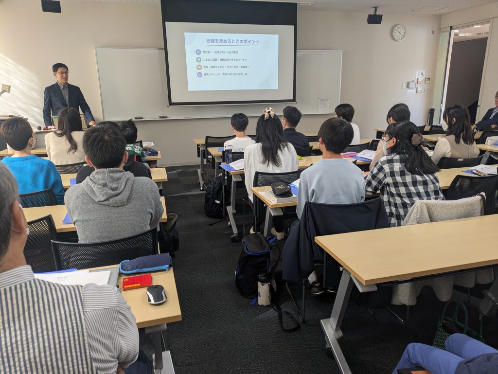 冒頭、開講に際して森井教授より、「研究とは、自分の中の『なぜ?』を解いていく作業。他人と比べるのではなく、自分と向き合い、コツコツ努力を重ねることが大切」とのメッセージが贈られ、参加者は研究への姿勢を改めて心に刻みました。