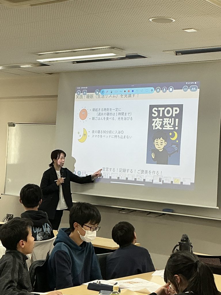 講座の前半では、睡眠の役割やメカニズム、体内時計の整え方についての講義を受け、自身の睡眠日誌と照らし合わせながら、日頃の睡眠習慣について多くの気づきを得ました。