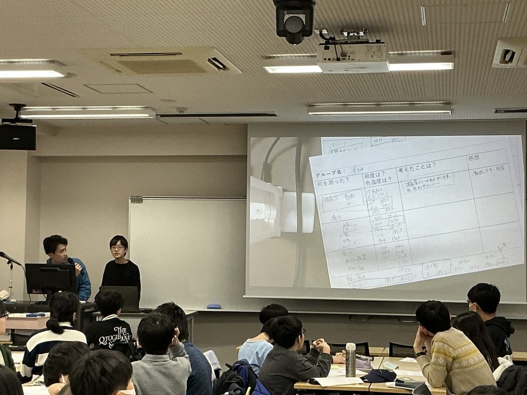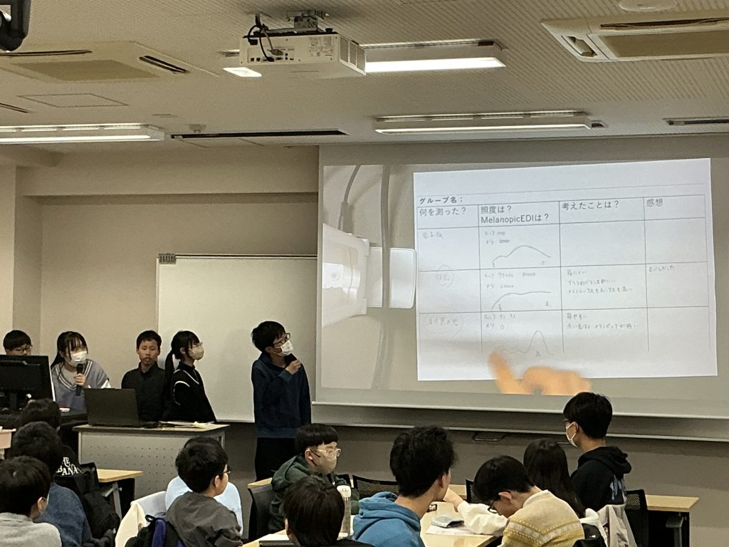 続いて、体内時計と光の関係、光が睡眠に与える影響について学びました。その後、受講生はグループごとに校内を巡り、特殊な測定装置を用いて身の回りの光の明るさや色合いを調査しました。測定後は結果を発表し、互いの気づきを共有しました。